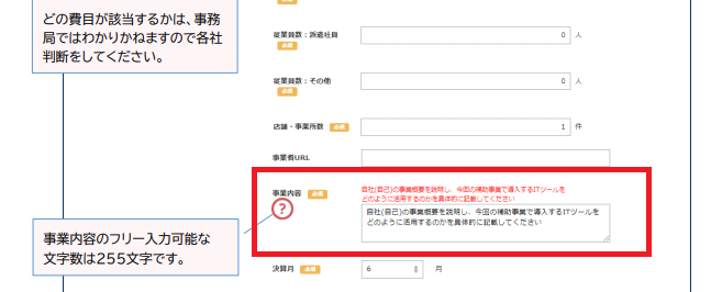 IT導入補助金Web申請時に、唯一とも言えるアピールを行える作文箇所の「事業内容」入力欄。