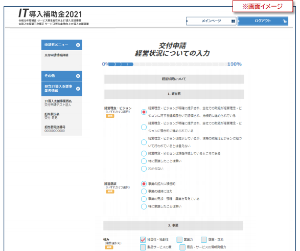 アンケートにチェックを入れて回答していく形式の「経営状況についての入力」箇所は、嘘の無い範囲でポジティブな内容で回答していきましょう!