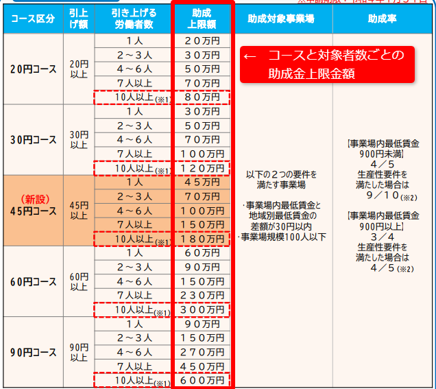 助成金額は最低賃金の上げ幅と人数によって異なります。