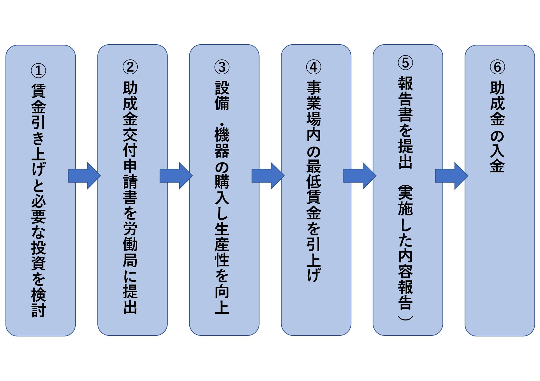 助成金の受け取りは、申請→決定→設備投資・賃上げ→助成金交付となります。